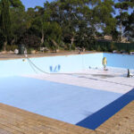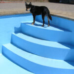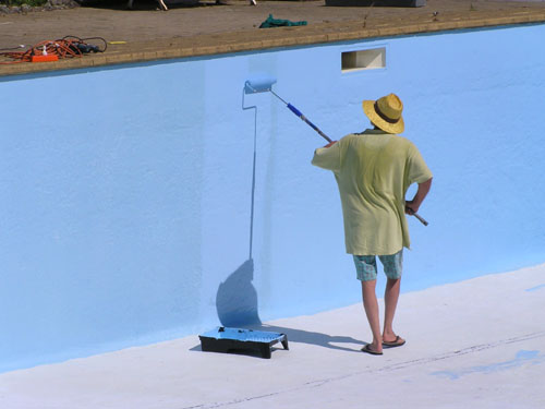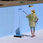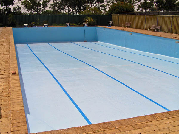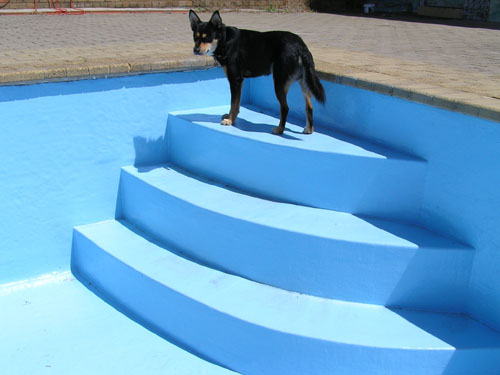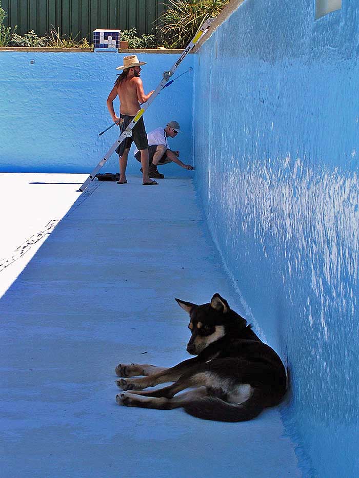 A beaut for Boystown! – Bondi Mid Blue Easy to apply swimming pool paint Pool paint is going on well by roller.ITAL CAMERA Paint is usually rolled on even in big projects as so easy. Products passed inspection. Paint protected, ready for filling and fun.