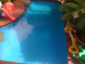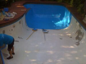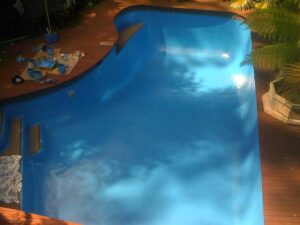Tasman transformation in Sydney The Marblesheen surface being cleaned up and repaired. Applying the first coat of Sapphire Dark Blue. Has great hiding power in one coat. The first coat covers it well, but needs another to finish it. The final result. Dive in.